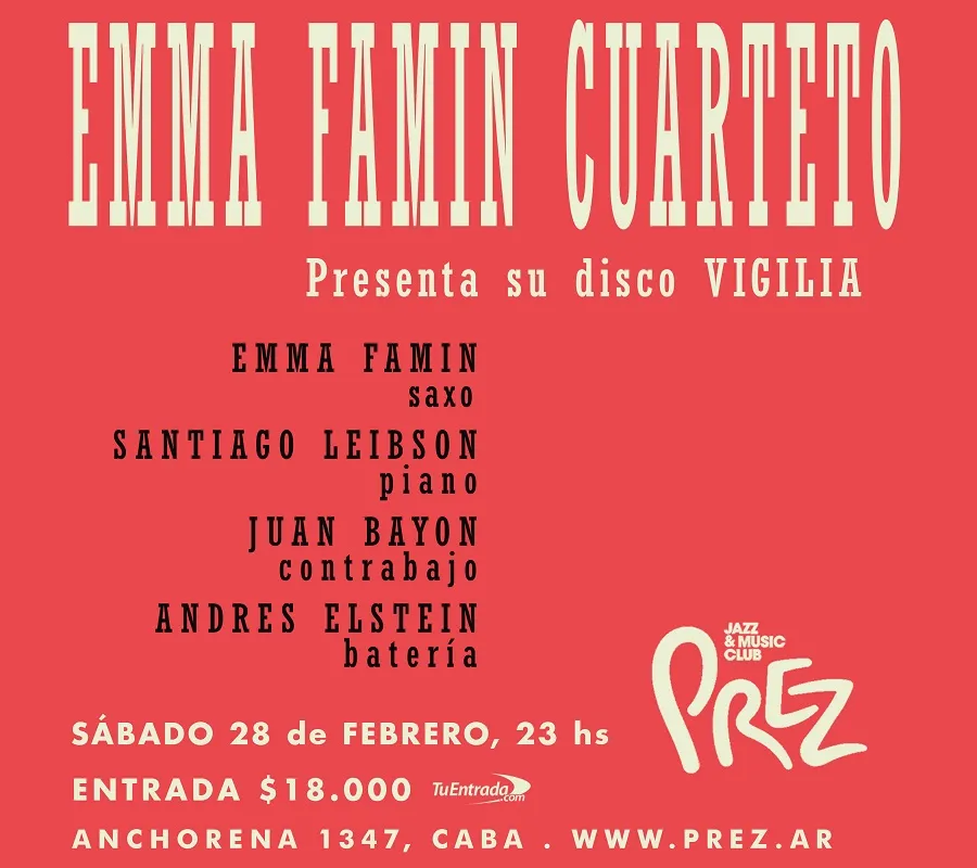 Emma Famin (saxo) Santiago Leibson (piano) Juan Bayón (contrabajo) Andrés Elstein (batería)